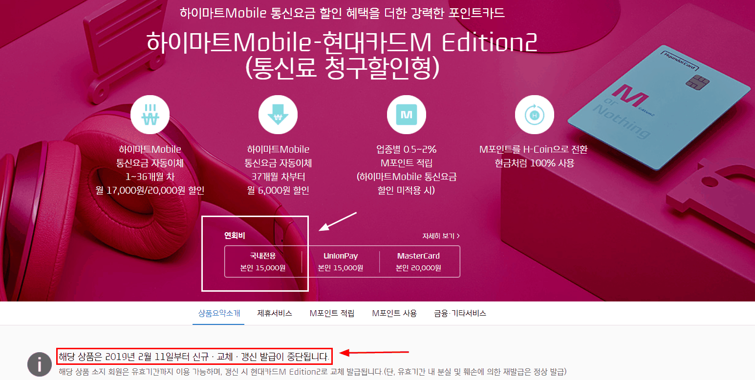 두번째 카드인 하이마트카드 국내전용 연회비(기본연회비 5,000원 / 제휴연회비 10,000원)중 기본 연회비는 면제가 되고 제휴 연회비만 청구가 됩니다.
