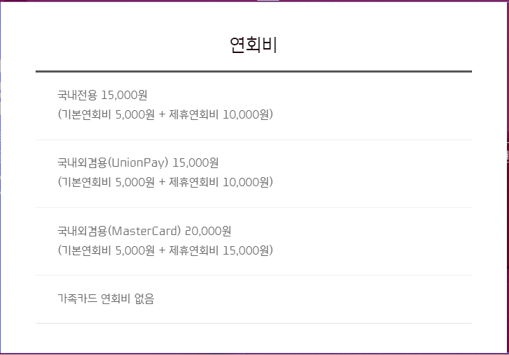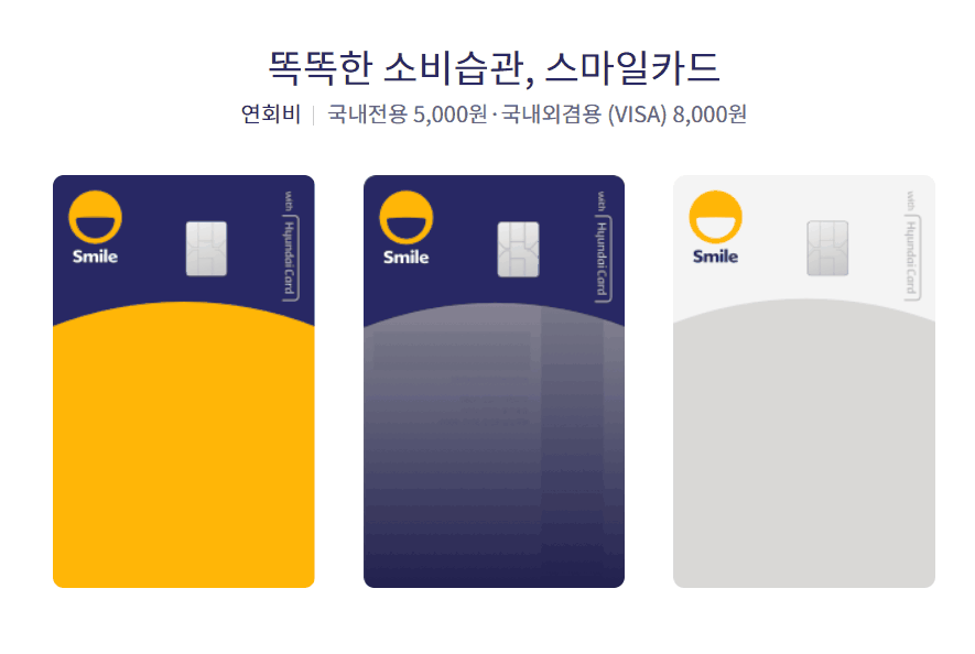 스마일카드: 국내전용: 기본연회비 5,000원 / 제휴연회비 0원, 국내외전용: 기본연회비 5,000원 / 제휴연회비 3,000원