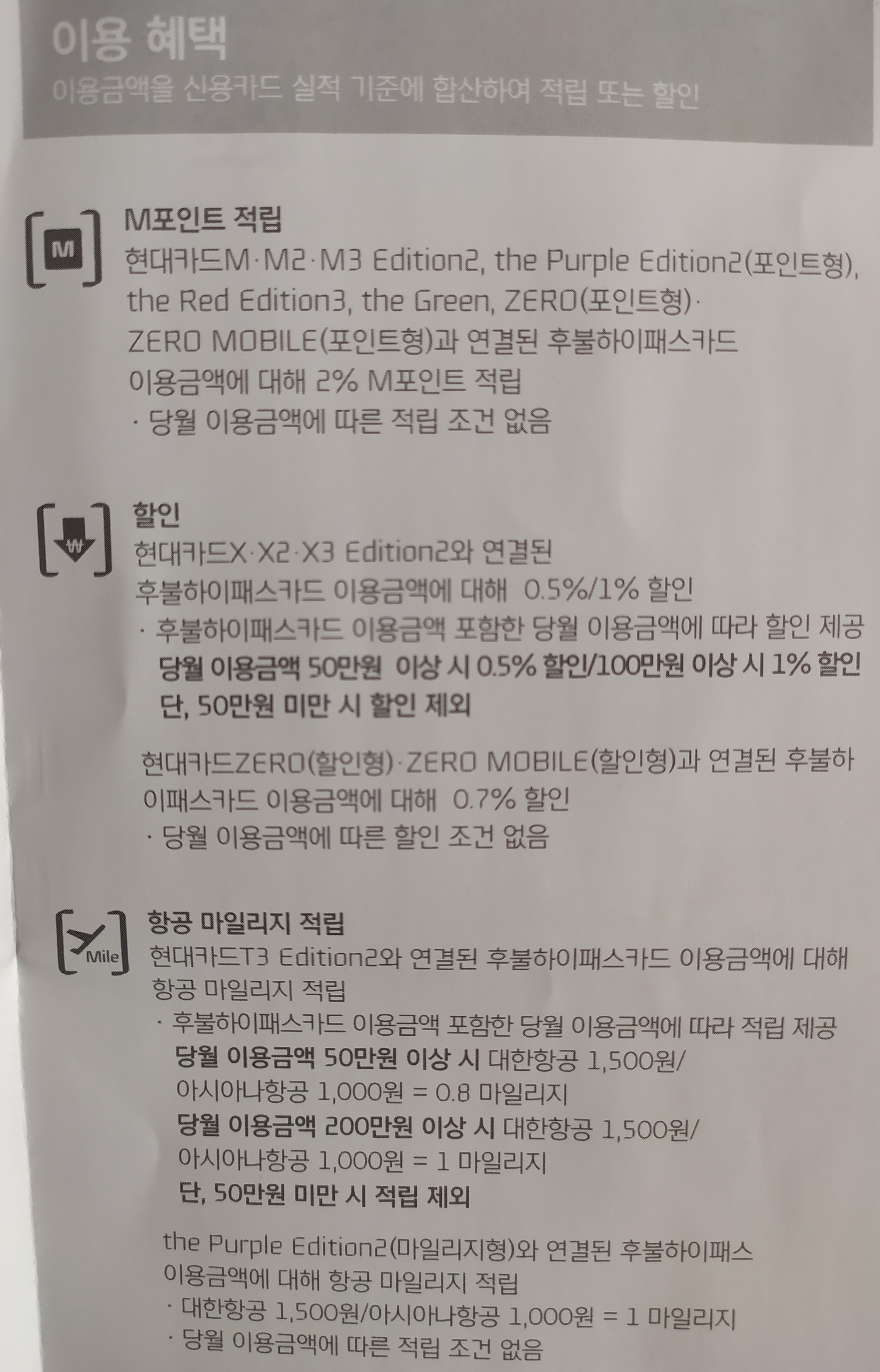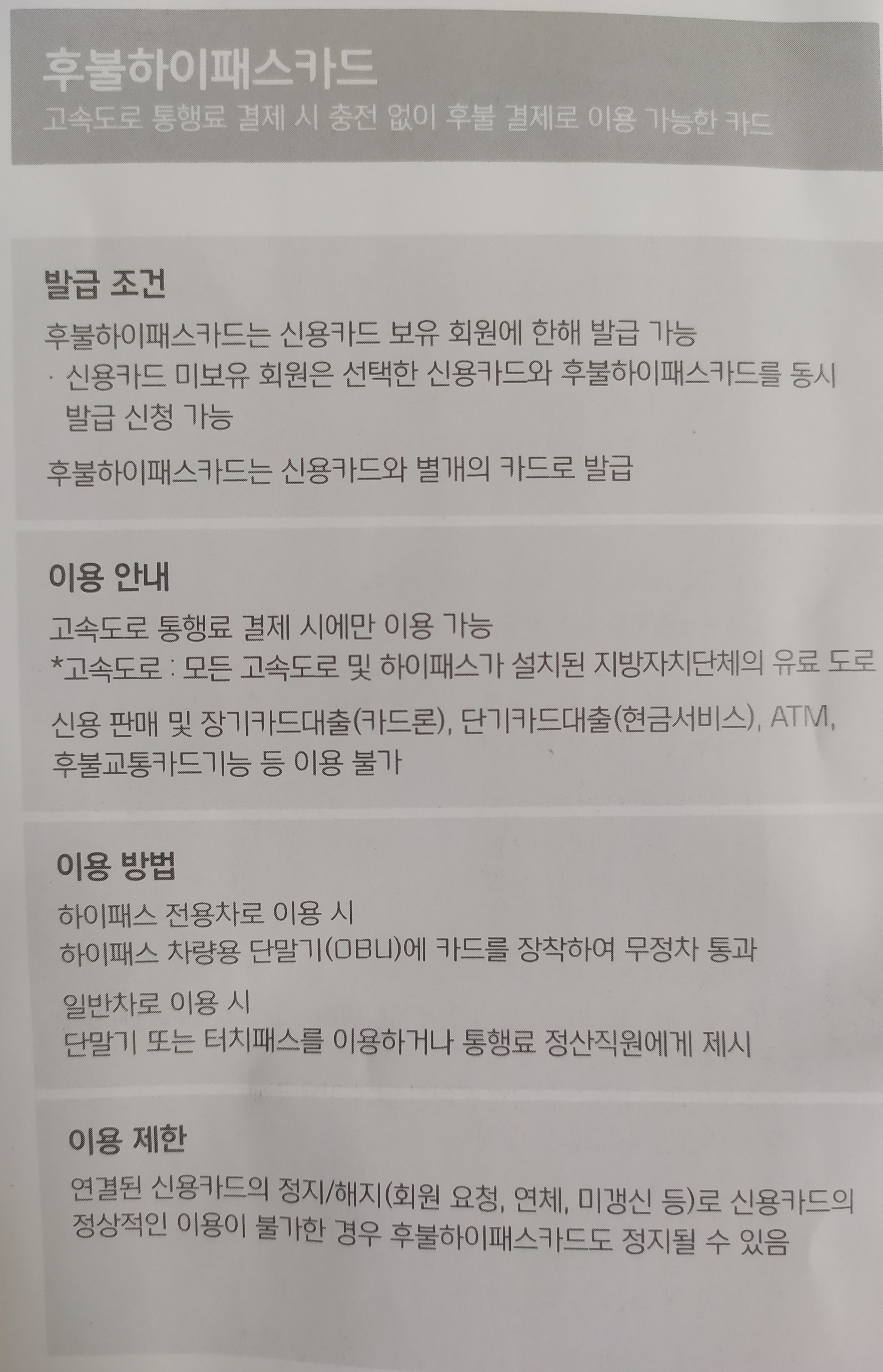 자... 이제 현대카드 M Edition2 하이패스 카드 설명서에 나온 내용을 나중에 참고 하기 위해서 기록형으로 포스팅 합니다. 하이패스 카드라 기능적으로 복잡한 부분이 없어서 추가설명없이 아래 이미지만 올립니다.