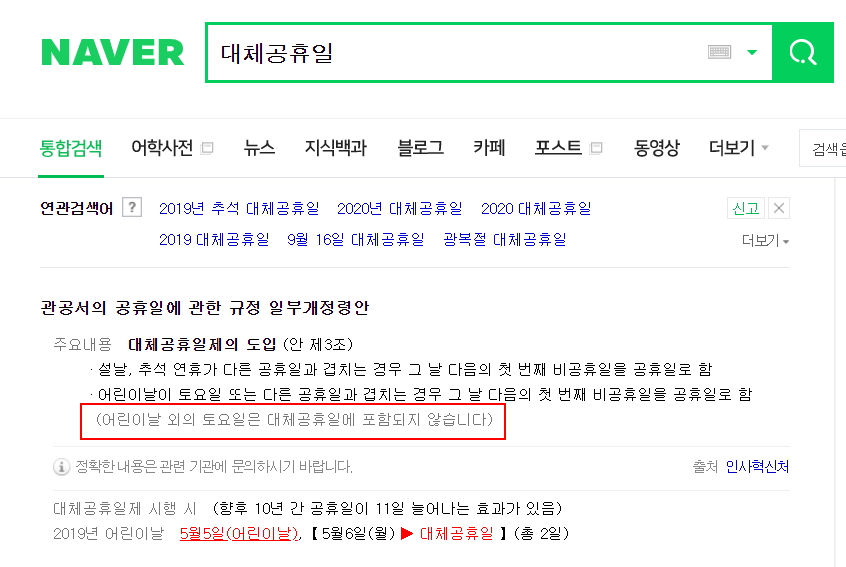 "어린이날이 토요일 또는 다른 공휴일과 겹치는 경우