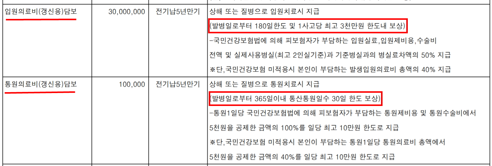 입원의료비: 입원치료시 보장가긴은 365일이지만 보상은 최대 180일(6개월)만 해준다.