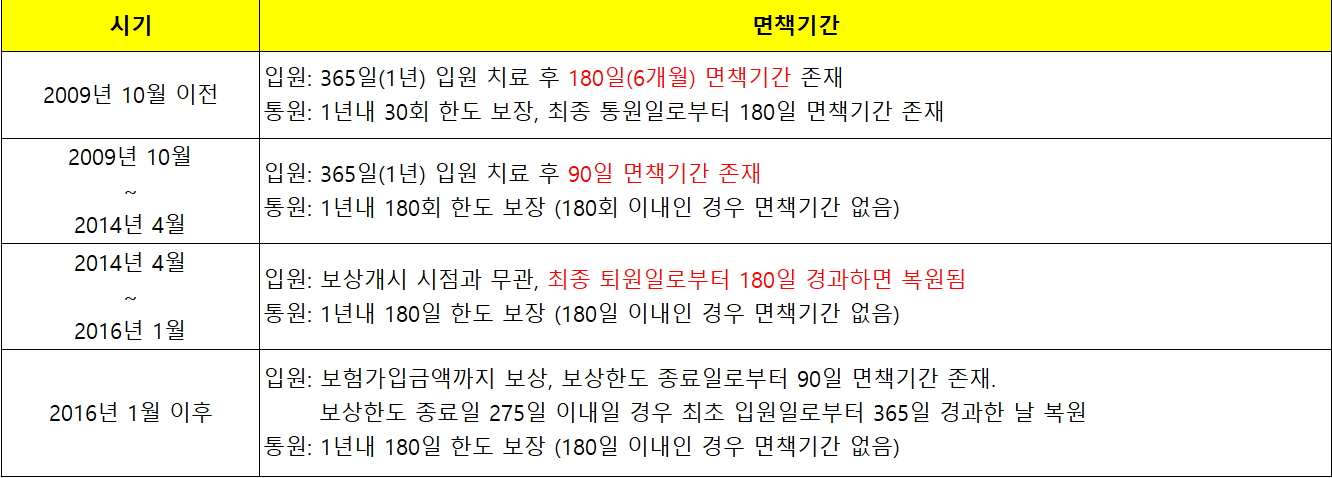 상해, 질병입원의료비: 입원일로부터 365일 보장 후 90일 면책기간 적용. 이전 180일 면책기간을 90일로 짧아진 점이 큰 변화 중 하나 입니다.