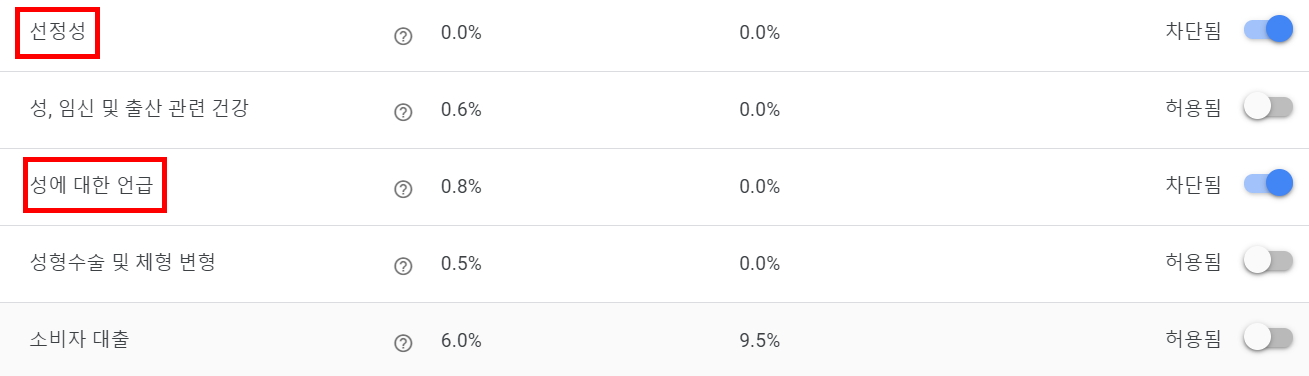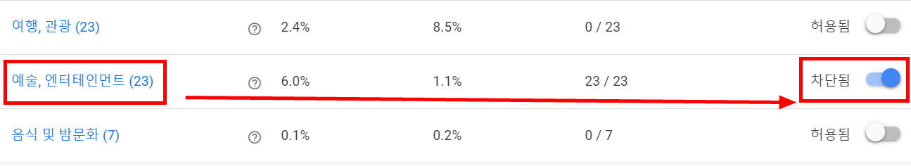 아래를 보면 자세한 서브카테고리를 볼 수 있는데요. 만약 차단하면 아래 서브카테고리 관련 광도도 모두 차단 한다는 뜻입니다.