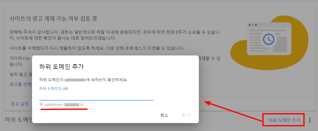 * 서브도메인이란? blog.sample.com 처럼 도메인 앞에 주소가 별도로 있고 그 주소로 사이트가 운영되고 있다면 이 서브도메인 또한 승인절차를 받아야 광고를 게재할 수 있습니다.