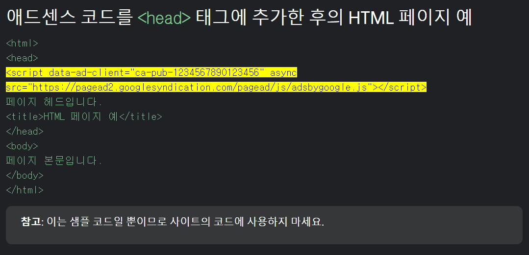 이 코드의 의미: 새로운 사이트에 광고를 달고 싶어서 신청을 했습니다. 그럼 구글에서는 신청한 사이트가 광고를 달아도 되는 적절한 사이트인지 아닌지를 확인해야 합니다. (사이트 소유자가 맞는지, 그리고 사이트가 애드센스 프로그램 정책을 준수하는지 확인). 물론 사람이 일일히 하는 것은 아니고 프로그램 적으로 그들만의 방식으로 검수를 하겠죠? 그 작업을 위해 위 코드를 위 샘플처럼 html 코드 <head>......</head> 사이에 넣어 주어야 합니다.