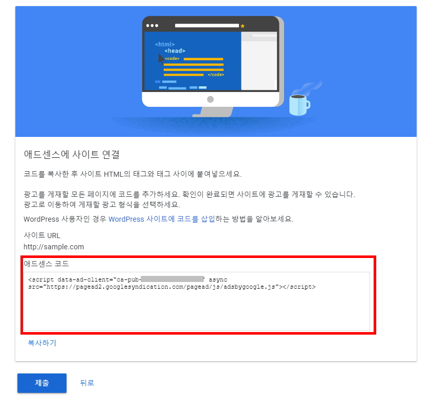신청한 사이트에 위 박스에 있는 애드센스 코드를 삽입해야 합니다.