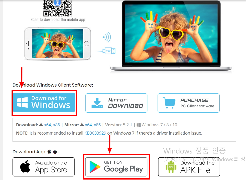 위 사이트 화면 입니다. 위 화살표 있는 프로그램은 컴퓨터에 설치할 프로그램 입니다. 이프로그램은 선없이 무선으로 컴퓨터와 핸드폰을 연결 해주는 역할을 합니다.