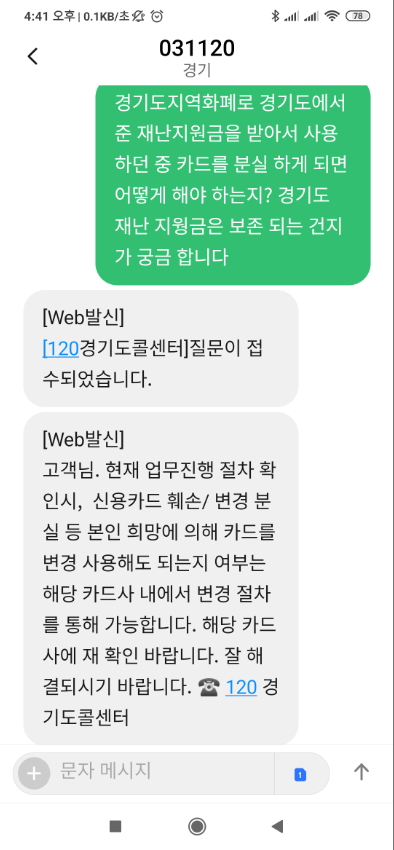 >> 기존 보유하고 있던 경기지역화폐 카드로 이번 경기도 재난기본소득을 신청 한 분들은 신청 후 3~4일내 입금이 되었습니다 (저 같은 경우 4일). 하지만 신청 후 지원금이 카드로 충전되기 전에 카드를 분실 한 경우 입니다. 정말 낭감한 상황이네요. 재발급은 경기지역화폐 앱에서 간단히 신청 가능 하기 때문에 문제 될건 없지만 경기도 재난기본소득 신청할 때 입력한 카드번호와 신규발급번호가 같은지? 다른지 모르겠지만 다르다면 어떻게 되나? 이런 걱정을 할 것 같아요.