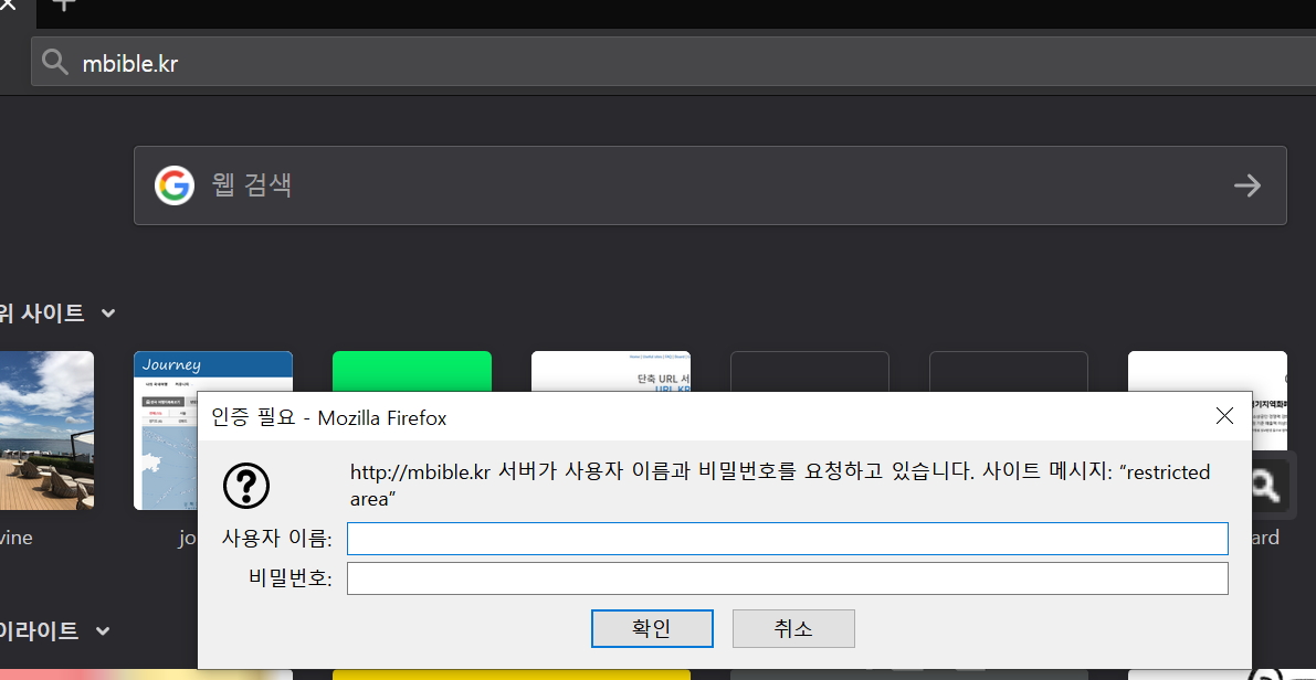 아래와 같이 사이트 접속시 아이디와 비밀번호를 요구 합니다.