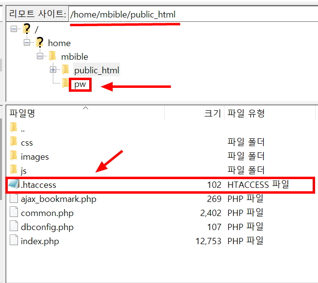 .htpasswd 파일은 일반적인 접근이 불가능한 root폴더(public_html) 상위에 pw 란 폴더안에 위치