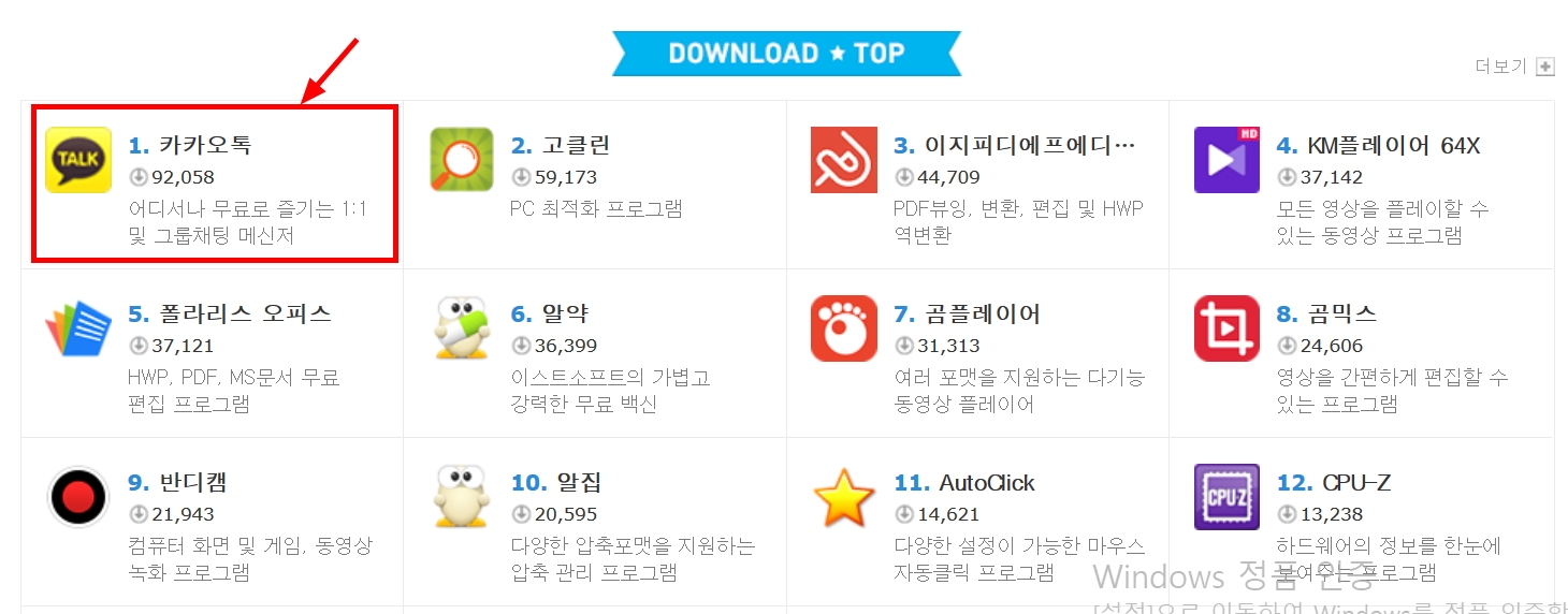 네이버 소프트웨어 부분에서 확인 한 결과 1위가 카카오톡 입니다.