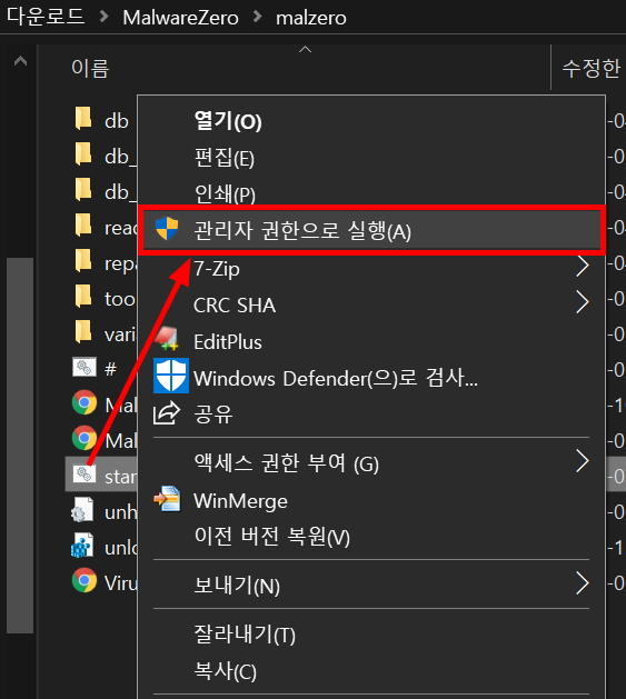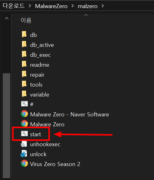 2) malzero 폴더 내에 존재하는 start 파일(start, start.bat : 톱니 모양 아이콘) 실행.