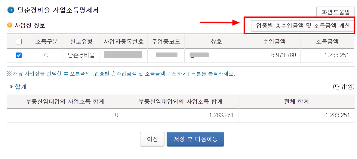 앞에서 등록한 사업장 정보가 보입니다. 해당 사업장을 선택 후 우측의 "업종별 총수입금액 및 소득금액 계산" 버튼을 클릭 합니다. 그러면 아래와 같이 입력 하는 화면이 나오고 "총수입금액" 에 종합소득세 신고할 총 수입금액을 입력 후 등록하기를 눌러 주면 됩니다.