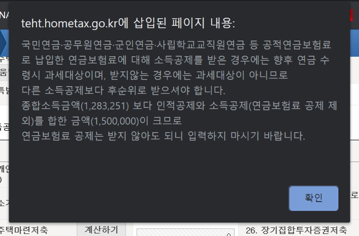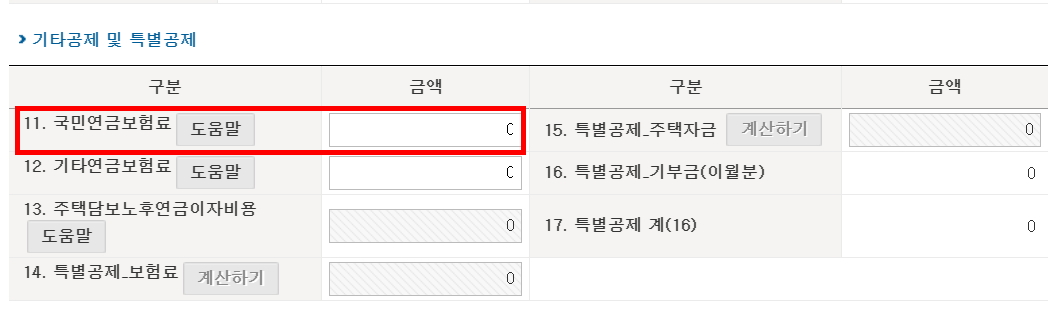 그래서 아래와 같이 특별공제 항목에 있던 국민연금보험료를 0원으로 수정했습니다.
