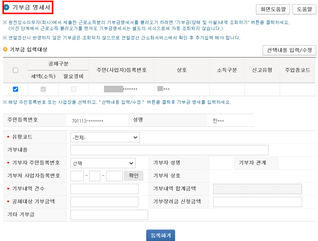 기부금이 있으면 입력 하는 곳입니다. 해당사항이 없다면 그냥 다음으로 넘어 가면 됩니다.
