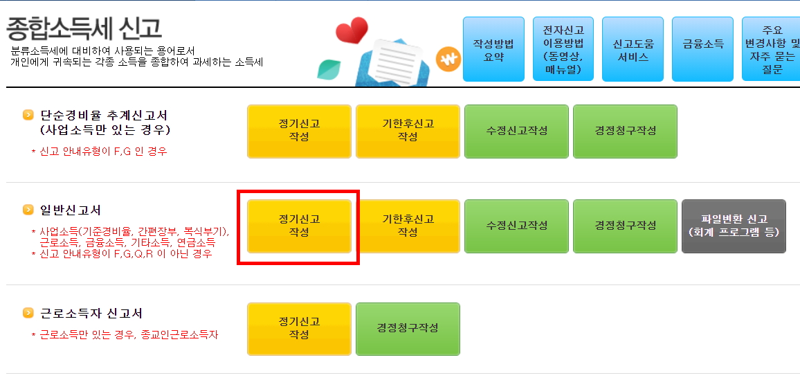 종합소득세신고 > 일반신고서 > 정기신고작성