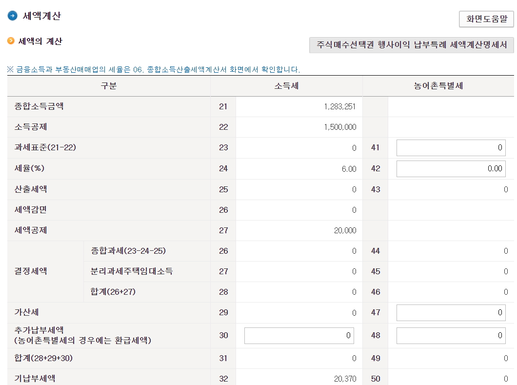 이제 납부할 세액을 지금까지 입력한 항목을 바탕으로 계산 하게 됩니다.