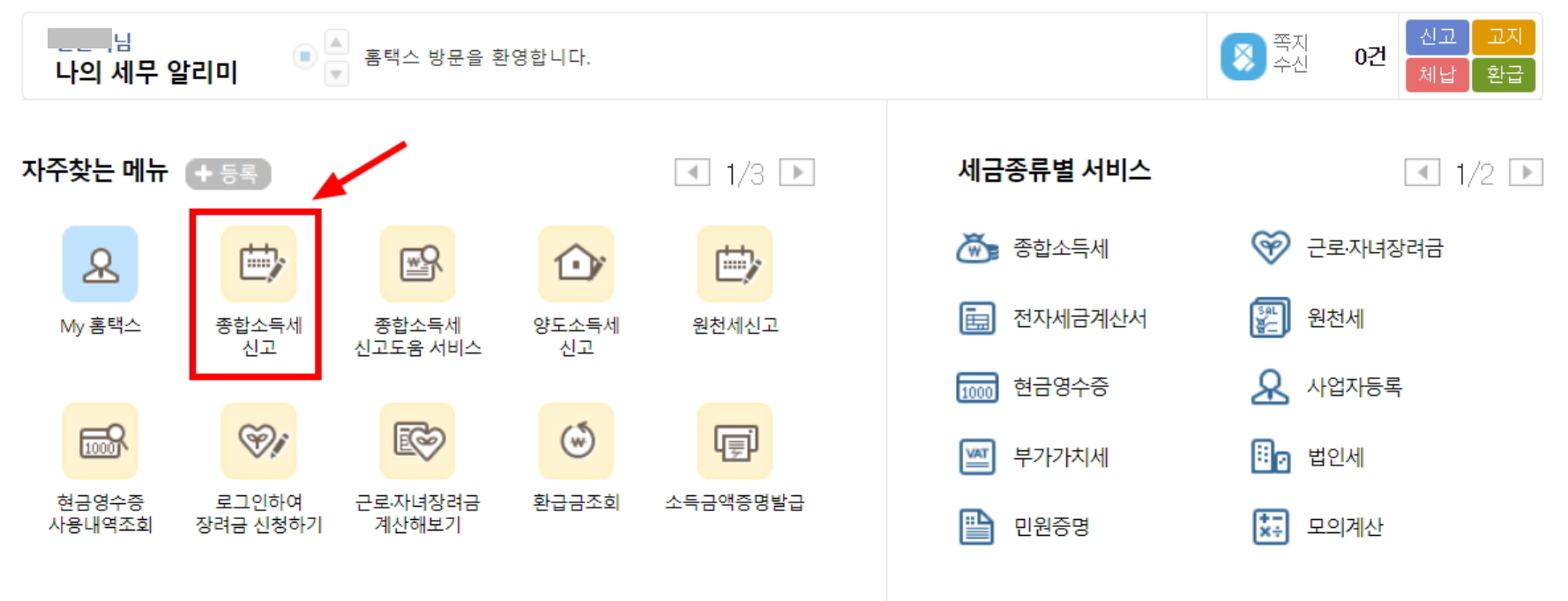 종합소득세 신고를 위해 국세청홈텍스에 공인인증서로 로그인 했습니다.