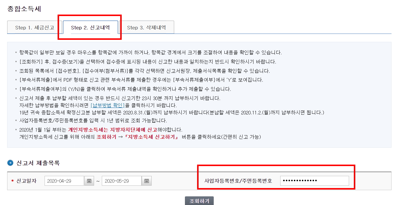 첫화면 종합소득세 신고 하는 화면에서 두번째 탭을 누르면 신고한 내역을 확인 할 수 있습니다.