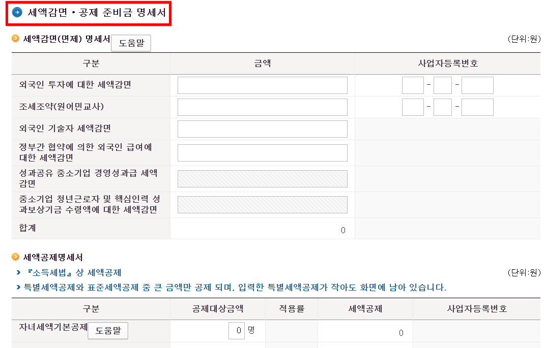 세액공제 신청 하는 부분입니다. 하단에 보면 공제 항목이 많은데 만약 해당된다면 금액을 넣어서 공제를 받으면 됩니다.