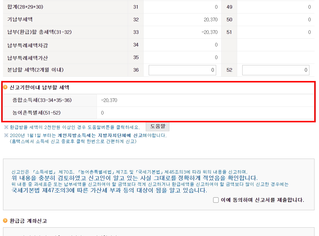 최종 납부할 세금을 확인, 전 마이너스로 뜨는데 환급받는건가요? ㅋㅋ 연말정산때도 마이너스로 뜨면 환급되었는데 어쩌면 환급될 수도 있겠네요. ㅋㅋ