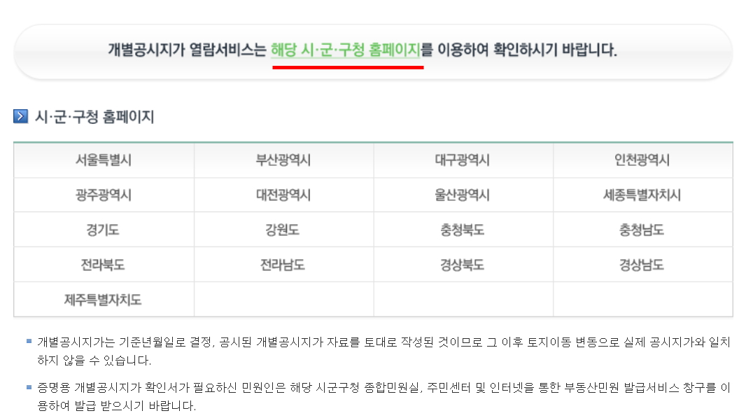 먼저 개별주택 조회를 해보겠습니다. 개별공시지가 열람서비스는 해당 시,군,구청 홈페이지를 이용 하라고 나옵니다.