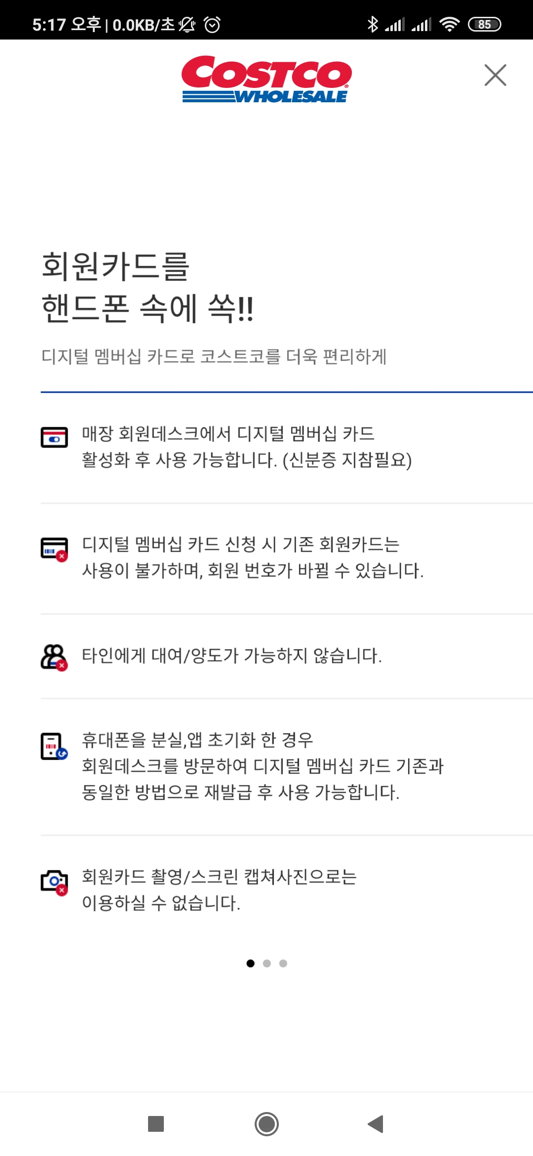 - 앱에 카드등록 후 코스트코 매장 회원데스크에서 본인 확인 절차를 거쳐야 등록이 완료 됩니다.