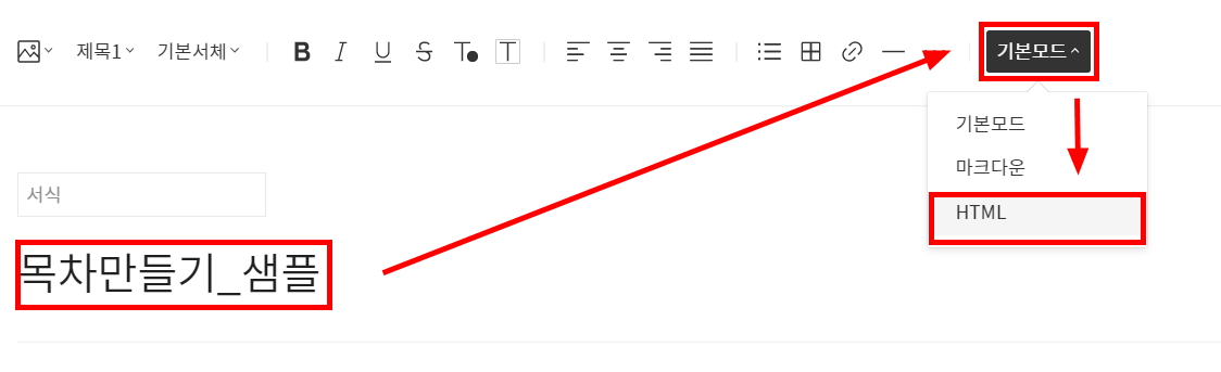 - 서식의 제목을 정하고 내용에 위에서 다운 받은 목차코드 소스를 넣어 주는데 글씨기 모드를 기본모드에서 HTML로 변경 후 붙여 넣기 해 주면 됩니다.