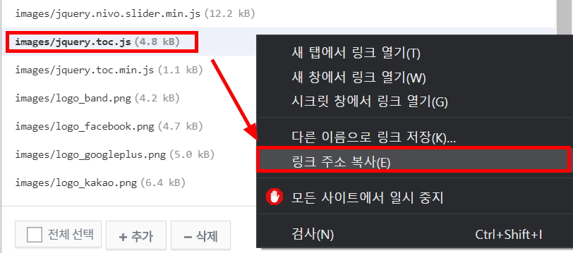 경로 확인은 아래와 같이 업로드된 파일클릭 오른쪽 마우스에서 링크주소 복사하기를 하면 됩니다.