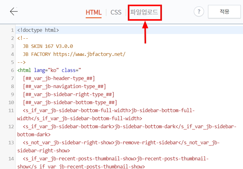 관리자모드 좌측메뉴 꾸미기 > 스킨편집 > html편집 > 파일업로드 > 파일추가