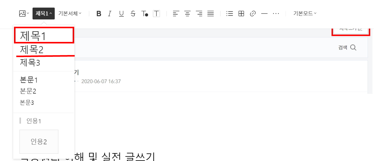 - 목차를 만들고 싶으면 "제목1"을 선택 후 타이틀을 만들어 주면 됩니다.
