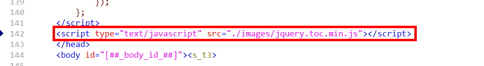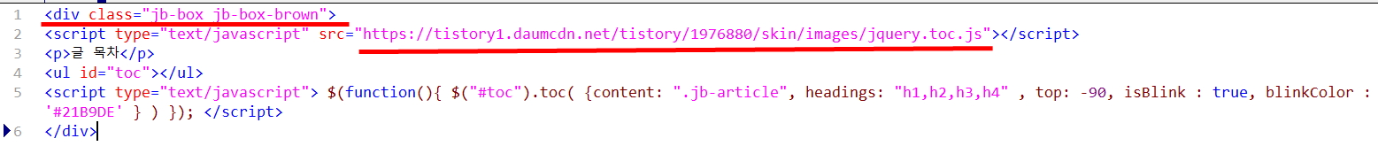2. 2번째 줄 긴 주소는 위에서 jquery.toc.js 파일 경로를 확인 한 것으로 변경 해 주면 됩니다.