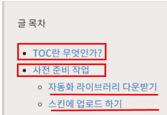 TOC(Table of Contents)의 약자로 컨텐츠테이블이란 뜻입니다. 티스토리 블로그에서 상단에 컨텐츠테이블로 시작하면 글 구성이 깔끔하고 논문같은 느낌의 고퀄리티 포스팅으로 보입니다. 오늘 알아 볼 것은 이 TOC를 자동으로 만들어 주는 작업을 할 예정 입니다.