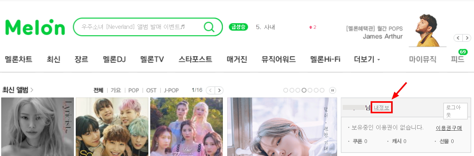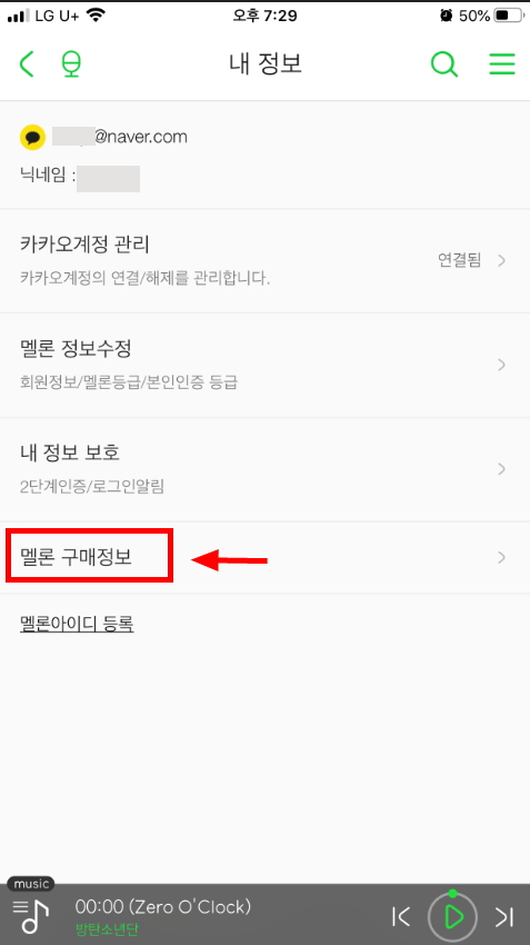 내 정보 페이지에서 상단 "멜론이용권/결제정보" 메뉴 클릭