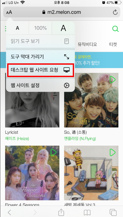아이폰 모바일에서 멜론 이용권 해지를 위해서 이번에 알아볼 방법은 PC버전으로 변경 후 데스크탑 컴퓨터에서 이용권 해지 하는 방법과 동일 한 방법으로 해지 시도를 할 예정 입니다.