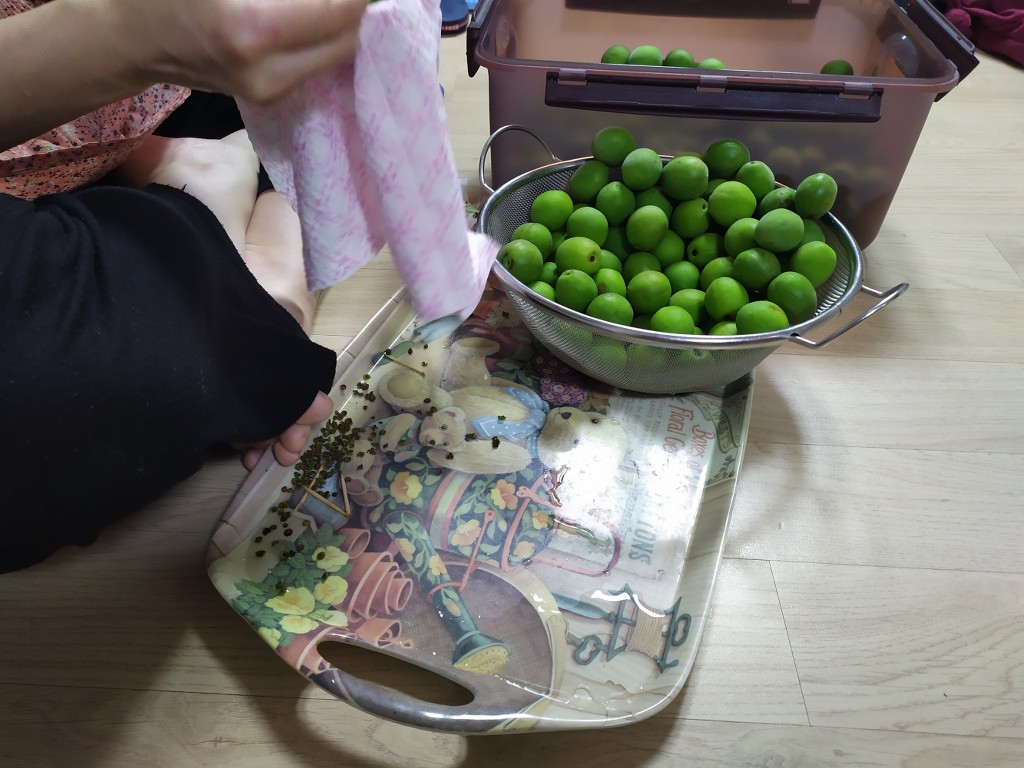 매실씨에는 아미그달린이라는 독성이 있어 씨를 빼주라고 하는데 일반적으로 3개월 이상 발효시키는 동안 그 독성은 사라진다고 합니다. 그래도 깔끔한걸 좋아 하는 우린 시간이 걸리는 노가다 작업을 합니다. ㅠㅠ