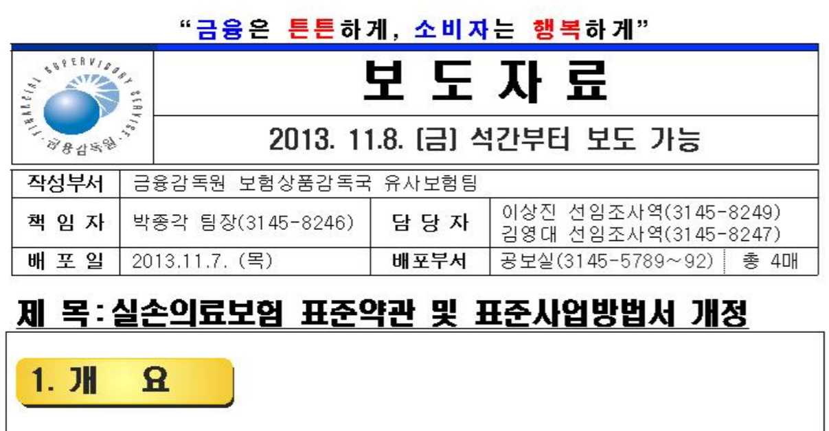 아래 내용은 2013년 11월 8일 금융감독원(금감원)에서 "실손의료보험 표준약관 및 표준사업방법서 개정" 제목으로 발행한 보도 자료 입니다.