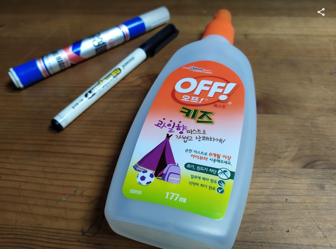 집에 에프킬라가 없어서 모기퇴치제를 예를 들어 보겠습니다. 비슷한 것으로 스프레이용 살충제 같은 것도 괜찮습니다. 성분이 기름성분으로 되어 있으면 됩니다. 이런 류의 뿌리는 기름기 있는 액체 성분류가 유성매직 지우는데 효과 적입니다. 집에 찾아보면 비슷하게 있을거에요.