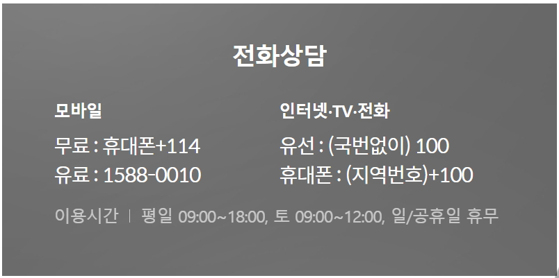 - 모바일 상품 관련 서비스만 이용 가능 (인터넷, 집전화 등 홈상품 및 와이브로 관련 문의는 100번으로 전화)