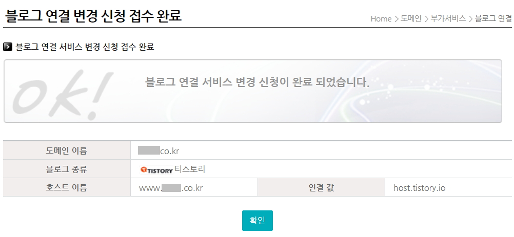 - DNS 설정정보: 위 호스팅케이알에서 도메인 연결 신청을 한것이 반영되어 "확인완료"로 나타난 것입니다.