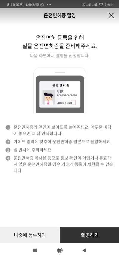 운전면허증을 등록하기 버튼을 누르면 촬영권한을 요구하고 모두 승인하면 핸드폰사진 촬영으로 운전면허증을 인식시켜 면허증의 정보를 읽어 옵니다.