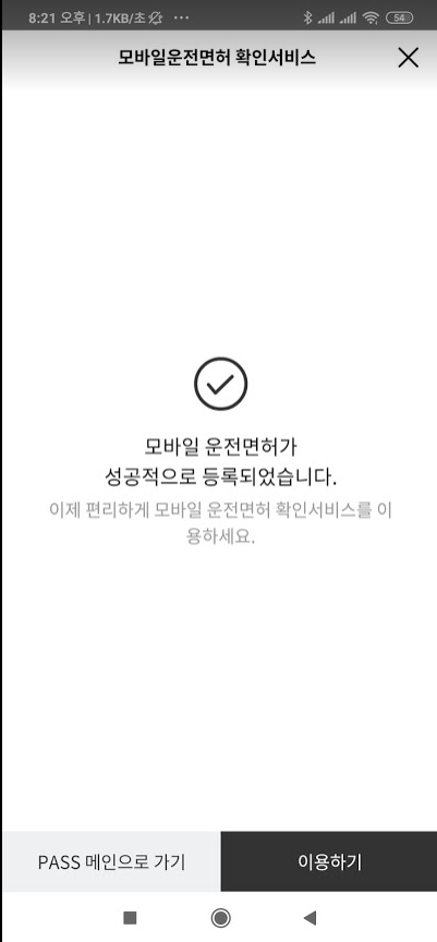 모든 정보를 입력하면 "모바일 운전면허가 성공적으로 등록되었습니다"라고 나오며 등록 완료 됩니다.