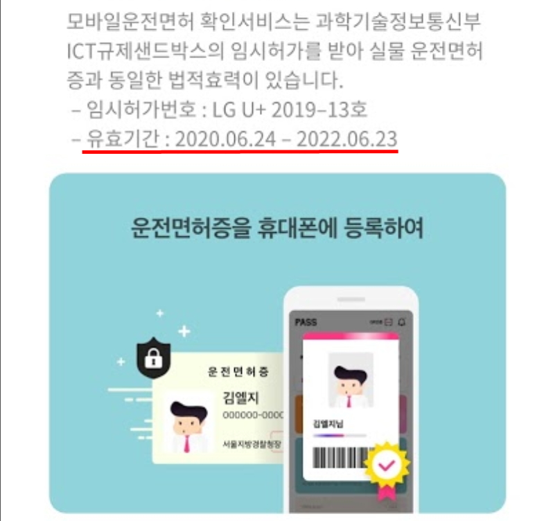 모바일운전면허 확인서비스는 아래와 같이 2022년 6월 23일까지 허가를 받아 실물운전면허증과 동일한 법적효력을 발휘한다고 안내되어 있습니다.