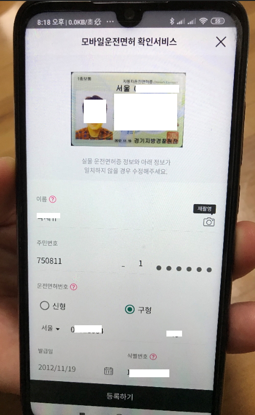 실제로 사진촬영으로 면허증을 등록해 보니 100%인식은 안될 수 있기 때문에 하나하나 정보 확인 후 등록 완료를 해주셔야 합니다. 저 같은 경우는 가장 중요한 식별번호를 인식하지 못하고 잘못된 정보가 들어가 있더라구요.