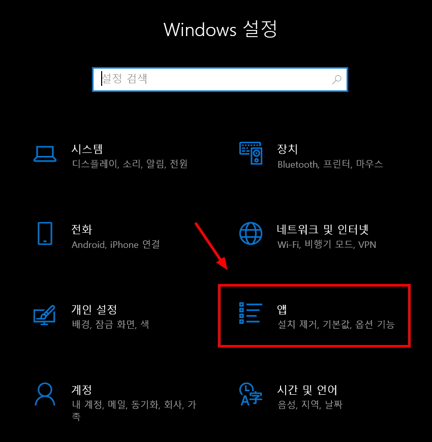 윈도우 설정화면에서 앱관리로 들어 갑니다.