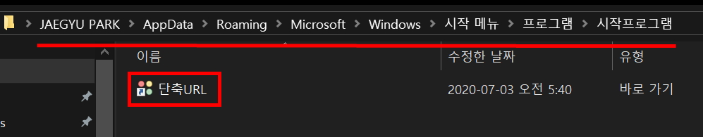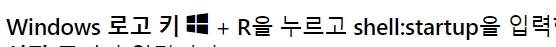 * 시작프로그램 폴더는 윈도우탐색기로 찾기가 힘들기 때문에 명령어로 시작프로그램폴더 위치에 접근해야 합니다.