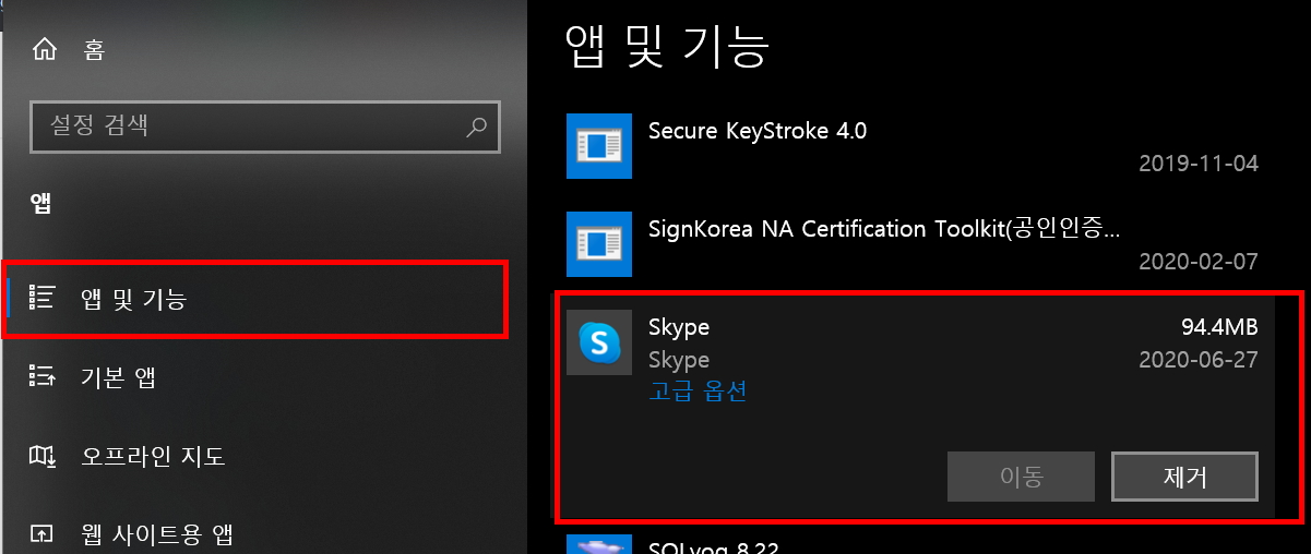 위 방법처럼 일시적으로 시작프그램에서 작동하지 않게 기능을 꺼 버리는 방법도 있지만 그냥 삭제하고 싶을때는 아래와 같이 앱관리 좌측메뉴 중 1번째에 있는 "앱 및 기능" 누른 후 우측 앱 중에서 삭제하고 싶은 프로그램 (앱)을 클릭하면 면 삭제할 수 있습니다.