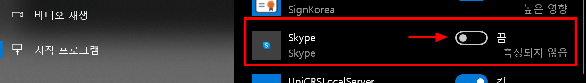 내가 뭘 설치한건도 없는데 윈도우 10인 업데이트 되면서 자동으로 프로그램이 시작된것 같은 느낌이 들어 확인 해보니 사용하지도 않는 스카이프 프로그램이 시작프로그램에 떡하니 들어 있는거에요.