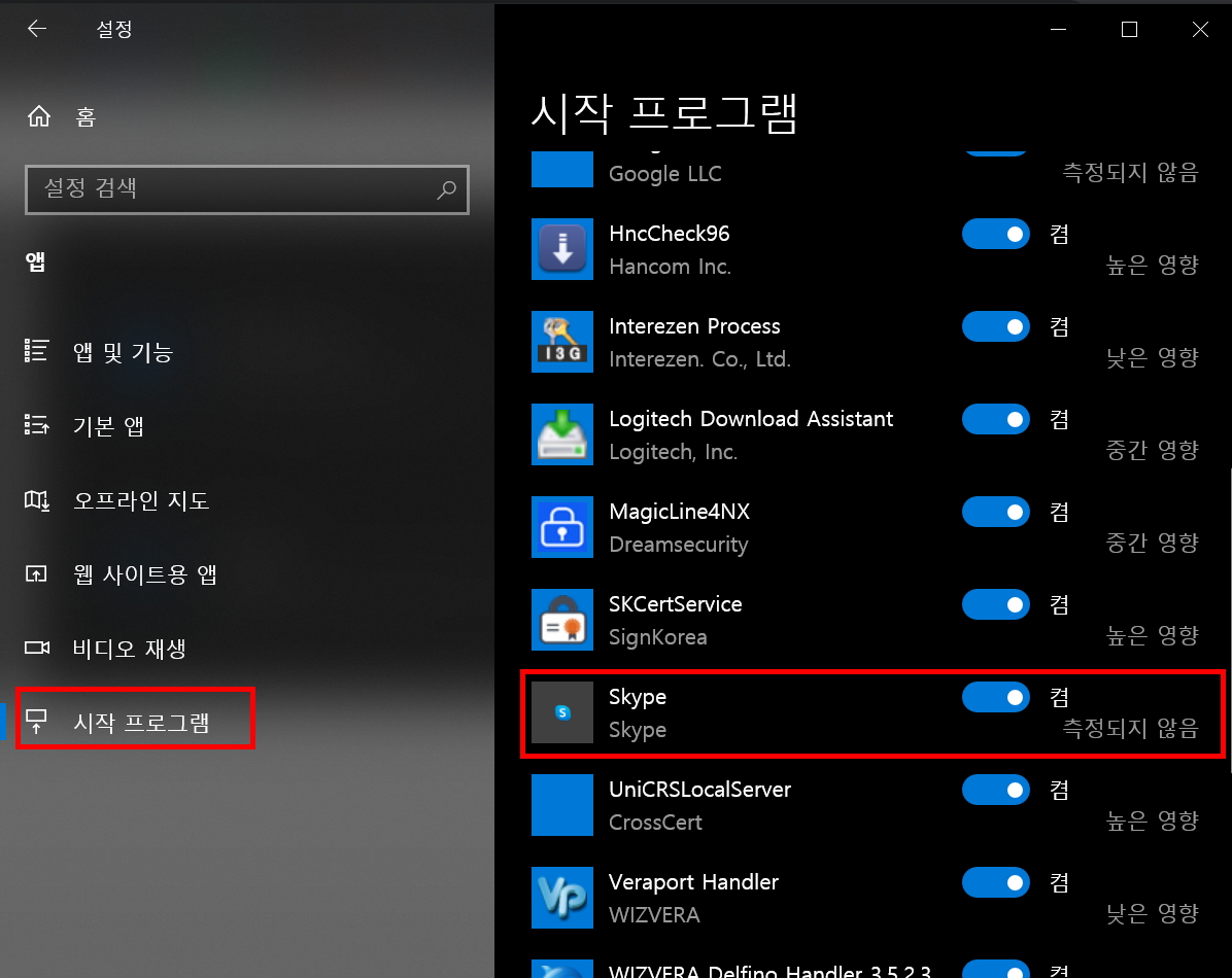 시작프로그램 > 앱실행 켜기/끄기