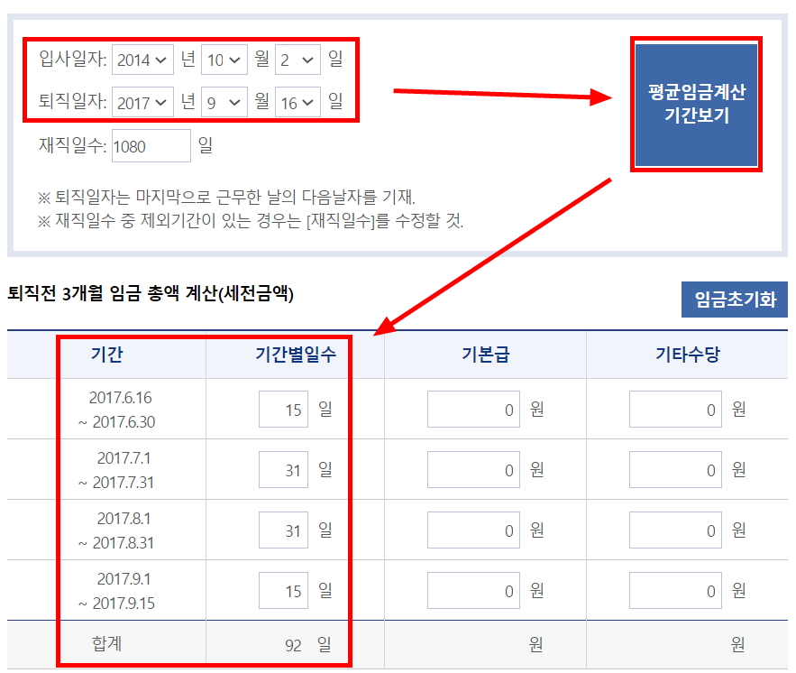 먼저, 입사일, 퇴사일을 입력 후 우측의 평균임금계산 기간보기를 클릭 했더니 아래에 기간과 평균임금이 자동입력 되어 나옵니다.